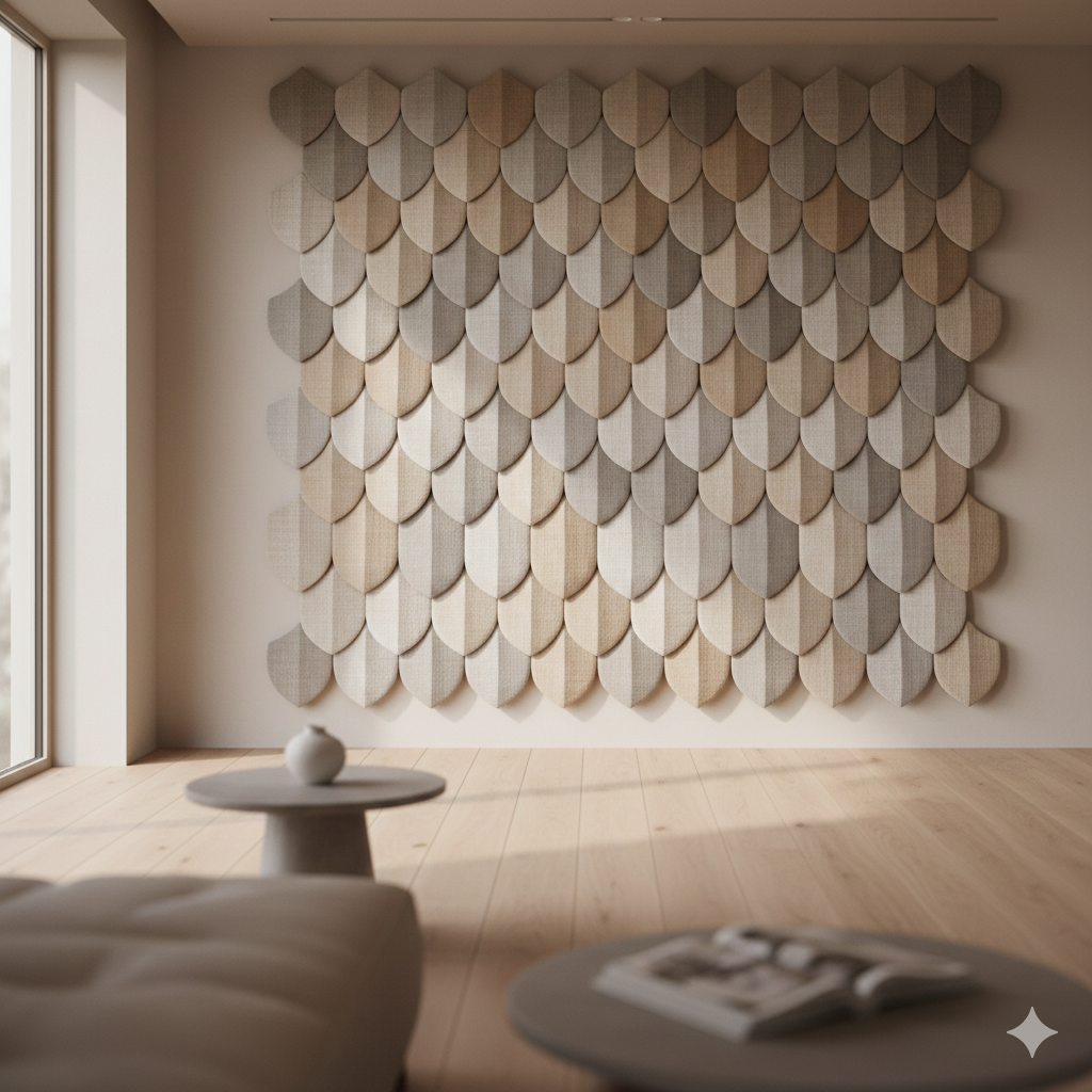 Stílusos halpikkely mintás falipanel, prémium kárpittal és finom ívelt formával. Látványos dekoráció, amely modern és harmonikus hangulatot teremt az otthon bármely szobájában.